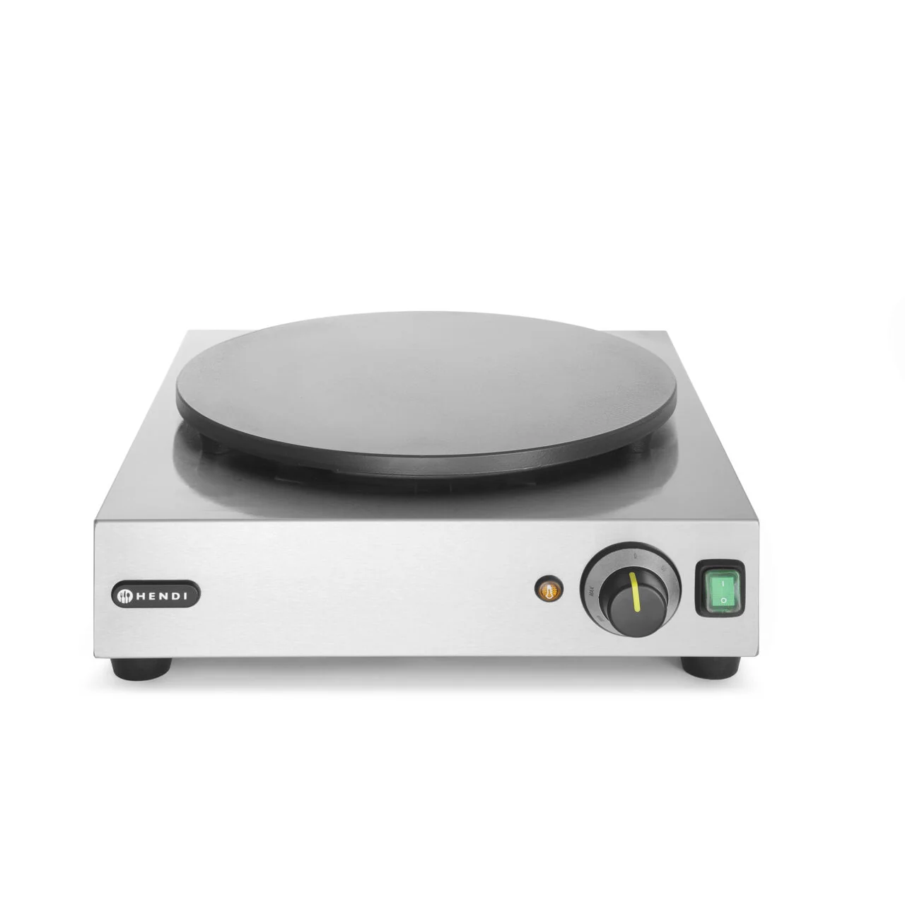 Hendi Smart Aparat Profesional pentru Clătite — Plita de fontă de Ø40cm cu termostat precis între 50°C și 250°C, putere 3000W și construcție robustă pentru serviciu HoReCa continuu.