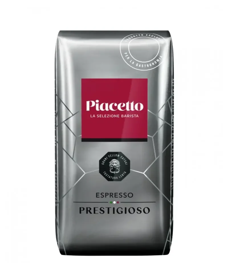 Prestigioso produce în ceașcă un espresso cu un caracter distinctiv față de blendurile Arabica+Robusta din restul gamei Piacetto. Textura catifelată este nota definitorie — o senzație de mătase în gură care face cafeaua plăcută și elegantă de la primul contact. Notele de nuci — alune, nuci ușor prăjite — sunt discrete și rafinante, nu copleșitoare. Dulceața naturală a Yellow Catuai este prezentă și clară — face cafeaua plăcută și fără adaos de zahăr. Finisajul curat înseamnă că nu rămâne nicio amărăciune sau notă reziduală neplăcută după ce ceașca a fost consumată — espresso-ul se termină cum a început: elegant și pur. Corpul este plin — suficient pentru a fi satisfăcător și consistent, fără greutatea excesivă a unui blend cu Robusta dominant.