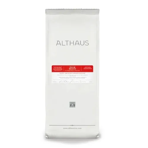 Ceai de fructe Althaus Palm Beach — 250g tisane premium tropical exotic (ananas, mango, papaya, cocos, citrice) fără cofeină. Aromă intensă dulce tropical plajă, culoare galben-portocalie vibrantă, gust exotic sunshine evocativ. Pentru cafenele specialty, hoteluri resort, restaurante oferind tisane escapism vacation tropical cu atracție dulceață naturală și versatilitate servire cald/rece summer signature bestseller.