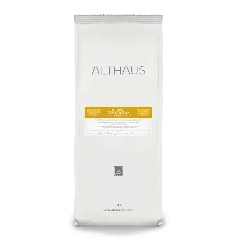 Ceai de plante Althaus Herbal Temptation — 250g tisane premium amestec ierburi aromate diverse (probabil mușețel, mentă, verbena, lemongrass, petale flori) fără cofeină. Aromă complexă ierboasă-florală, gust echilibrat blând reconfortant. Pentru cafenele wellness, hoteluri servire seară, centre spa oferind tisane relaxantă rafinată cu beneficii calmante multiple și atracție aromatică seducătoare.