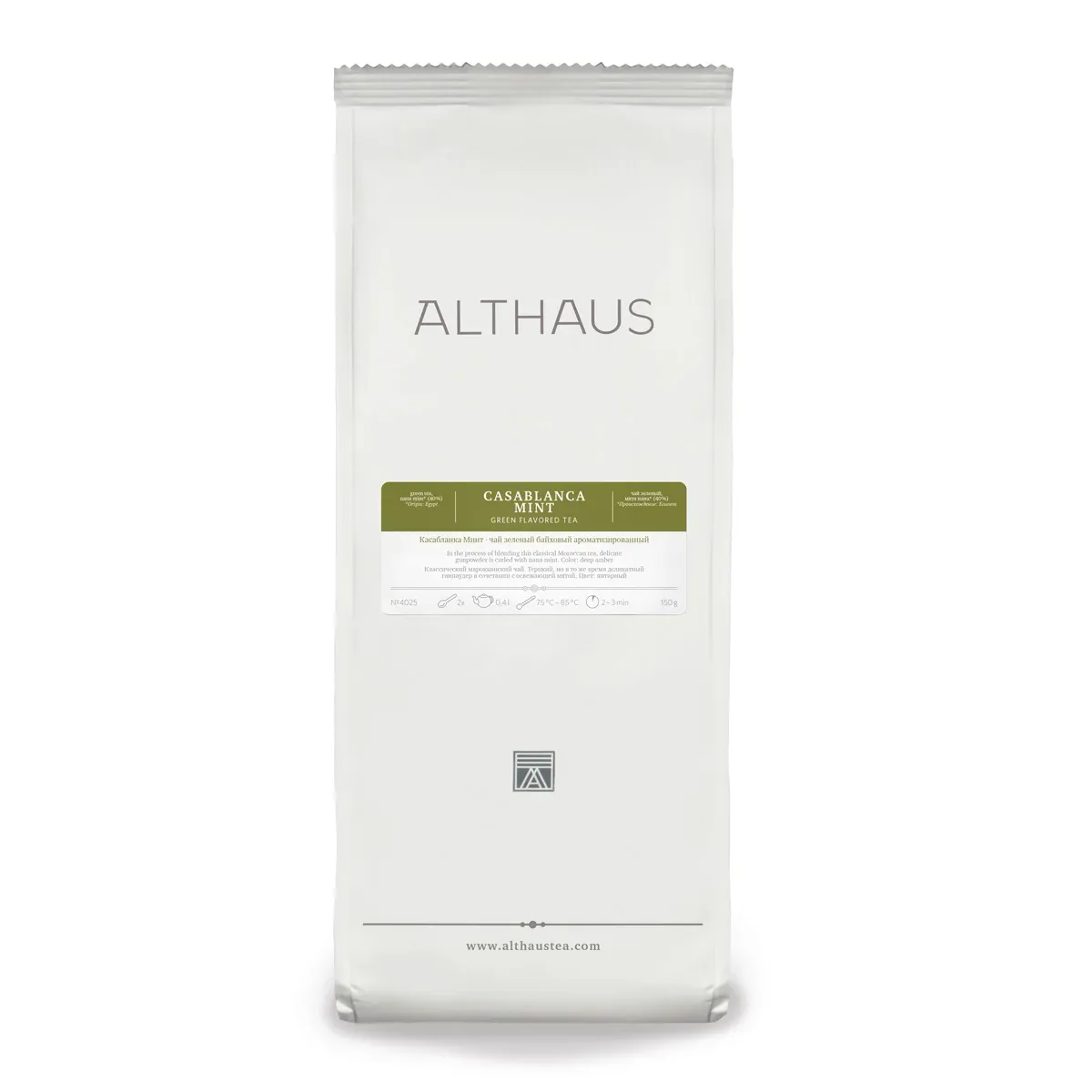 Ceai verde Althaus Casablanca Mint — 150g blend premium ceai verde chinezesc Gunpowder cu mentă proaspătă intensă. Rețetă inspirată din tradiția ceaiului marocan, aromă fresh cooling revigorantă. Pentru cafenele, hoteluri, restaurante mediteraneene/orientale oferind ceai clasic răcoritor cu beneficii digestive și experiență culturală autentică nord-africană.