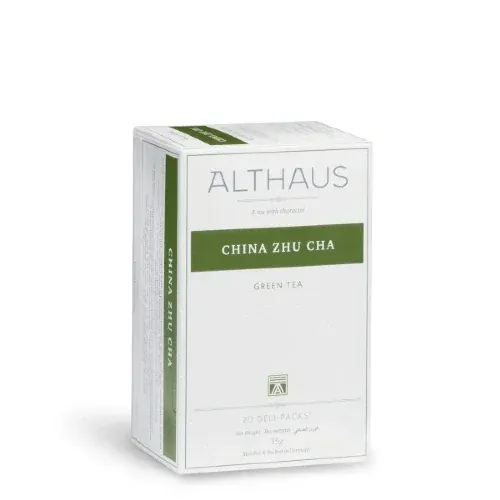 Ceai verde Althaus Deli Pack China Zhu Cha — 20 plicuri ceai chinezesc Gunpowder premium. Frunze rulat în bile mici, aromă intensă vegetal-smoky, gust robust. Pentru cafenele, hoteluri, restaurante care oferă ceai verde traditional chinezesc cu caracter puternic și autenticitate garantată Althaus.