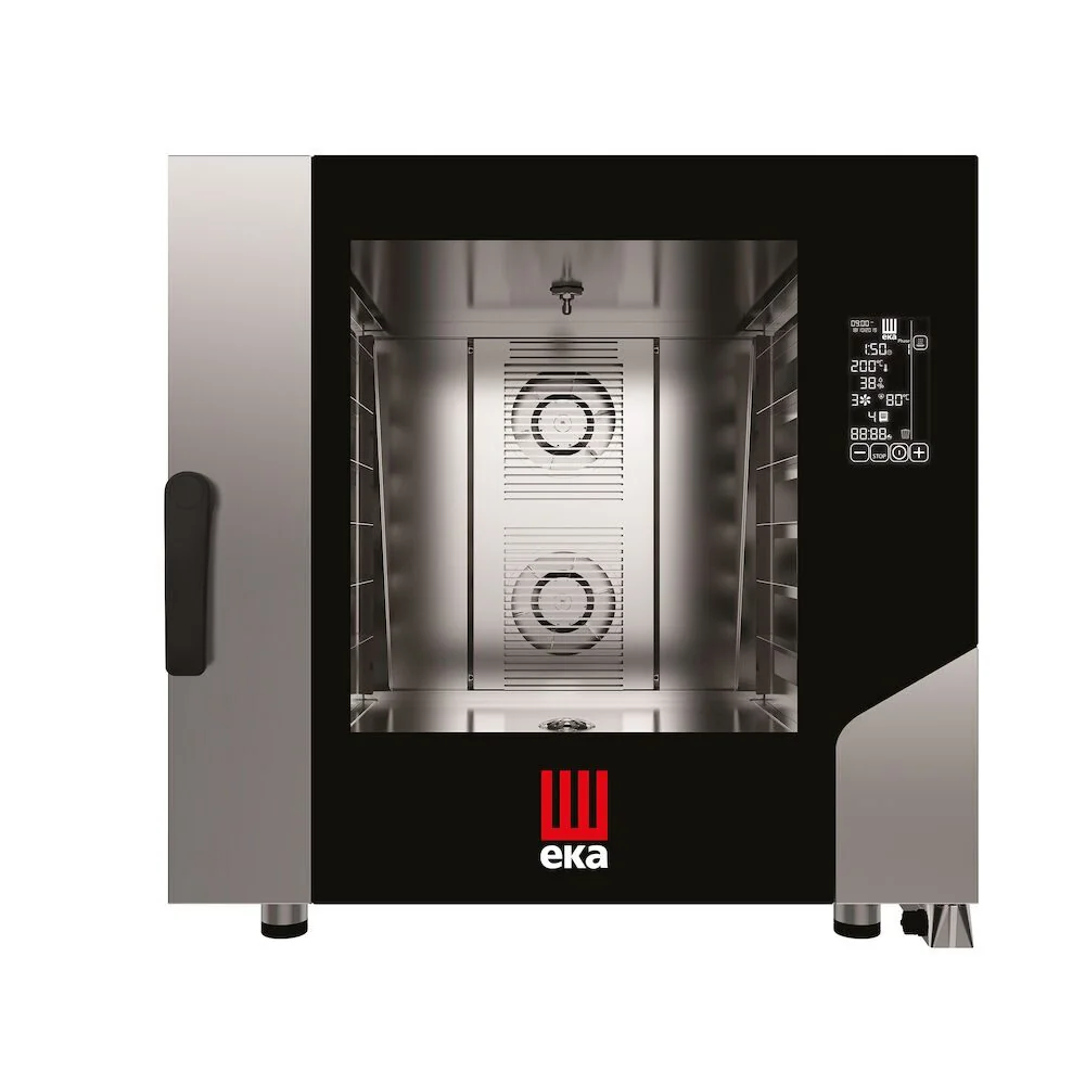 Sisteme Tecnoeka brevetate: -AirflowlogicTMM: deflector reproiectat pentru îmbunătățirea circulației aerului; permite coacerea uniformă pe fiecare nivel. HumilogicTM: apa pulverizată în spatele ventilatorului asigură un nivel ridicat de umiditate cu un consum mai mic de apă; nu numai că reduce consumul de apă, dar aduce şi aroma noastră naturală de pe vase. Dotat cu un port USB - pentru descărcarea datelor HACCP. Programabil: se salvează 100 de programe (formule), cu până la 10 paşi în fiecare. Programarea unei porniri întârziate cu până la 24 de ore. Setarea duratei de funcționare până la 11h 59min sau funcţionare continuă. Protecție la supraîncălzire. Capacitate cameră: 5 tăvi 600x400 mm (nu sunt incluse în set). leşire: 108-180 vase/per. Clasificare impermeabilă: IPX 4. Interval de temperatură: de la 30°C la 270°C. Spațiere suport tavă: 80 mm.