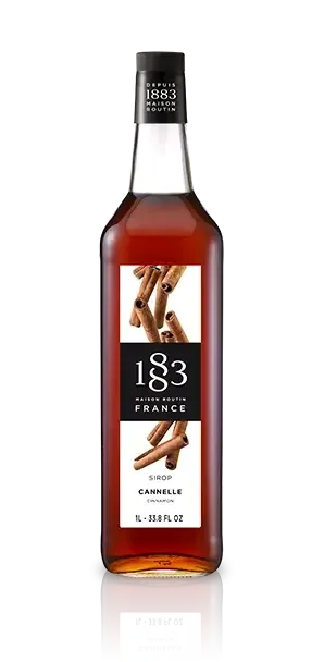 Sirop 1883 Scorțișoară 1L — Siropul scorțișoarei premium cu parfum dulce și lemnos, gust delicios de condimentat amplificat de note discrete de piper, pe bază de zahăr din trestie de zahăr, apă pură alpină și aromă naturală de scorțișoară, creat de Maison Routin în Alpii francezi pentru cafenele și baruri care vor scorțișoara reală în fiecare băutură.