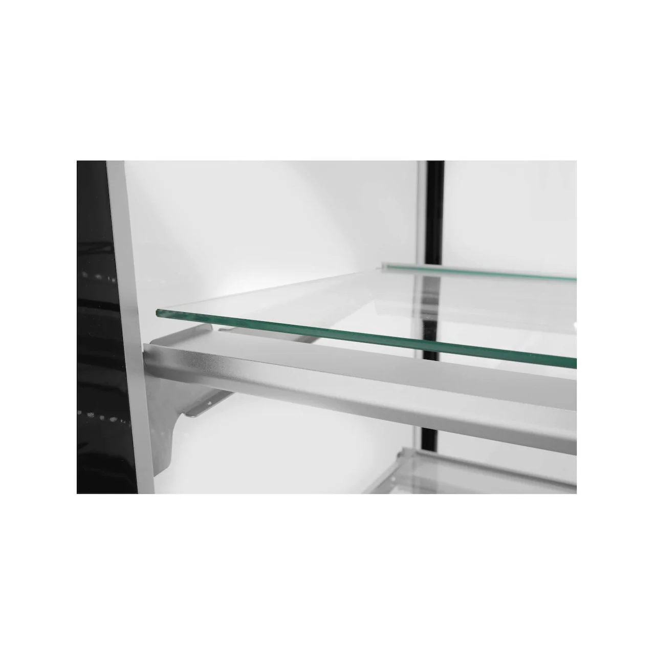 Carcasa din otel inoxidabil prevazuta cu geam dublu. 2 usi glisante Functie auto-defrost, compresor amplasat sub camera. Cu iluminare LED in partea de sus si sub fiecare raft. 4 roti care asigura mutare usoara, 2 roti su