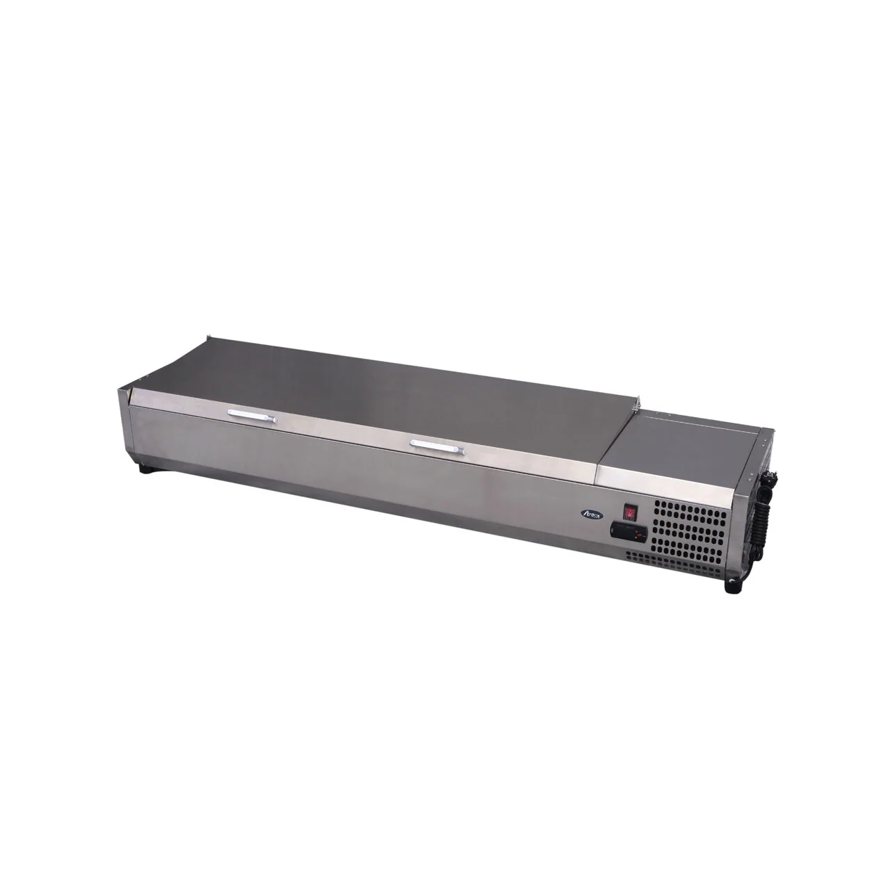 Capacitatea de 6 recipiente GN 1/3 cu adâncime maximă de 150mm acoperă toate recipientele GN 1/3 standard de pe piață — tavițele de 40mm, 65mm, 100mm și 150mm se potrivesc toate perfect. Formatul GN 1/3 este standardul universal pentru ingredientele de pizzerie (mozarella, toppinguri, legume), salatele de bufet, sosurile și garniturile de la liniile de preparare și preparatele reci expuse la vitrinele de tip deli. Containerele nu sunt incluse — vitrina este compatibilă cu orice set de recipiente GN 1/3 deja existent în dotarea localului.