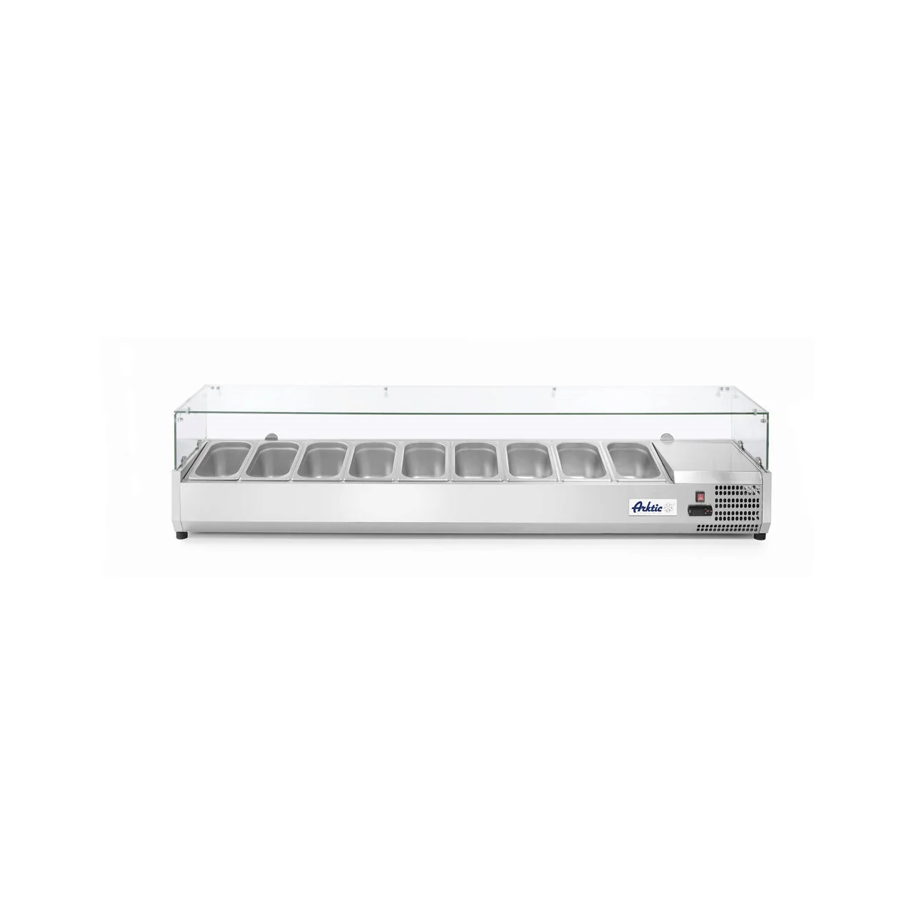 Vitrină de prezentare HENDI ARKTIC din inox pentru 9 vase gastronorm GN 1/3 — echipament profesional de refrigerare și expunere ingrediente la rece pe linia de servire în pizzerii, restaurante, salad bar-uri, sushi bar-uri și bucătării profesionale. Interval temperatură -2/8°C optimizat pentru ingrediente foarte proaspete și pește crud, putere electrică 180W, dimensiuni orizontale extra-lungi 2005x395x(H)430mm pentru instalare pe tejghea sau blat de lucru, construcție corp inox alimentar AISI 304. Soluție ideală pentru menținerea la temperatură optimă a ingredientelor proaspete direct la locul de asamblare preparatelor — acces rapid la 9 compartimente organizate, vizibilitate completă, conformitate HACCP și eficiență operațională maximă în operațiuni cu volum mare.